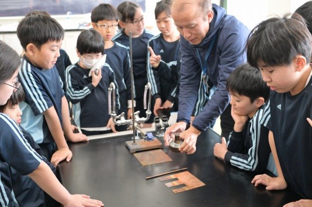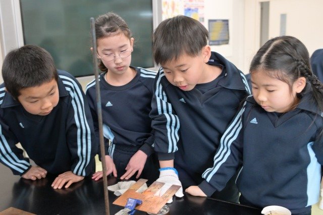 ろうが溶けていく様子や、熱が少しずつ伝わっていく様子をじっと見つめながら、「同じように広がっていくね」「どうして火の上の方が熱いのかな」など、さまざまな声が聞こえてきました。