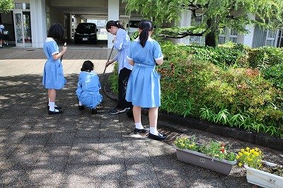6月になり、初等部の制服も夏服に変わりました。朝、5年生の有志が玄関付近の掃除を自主的に取り組んでくれています。