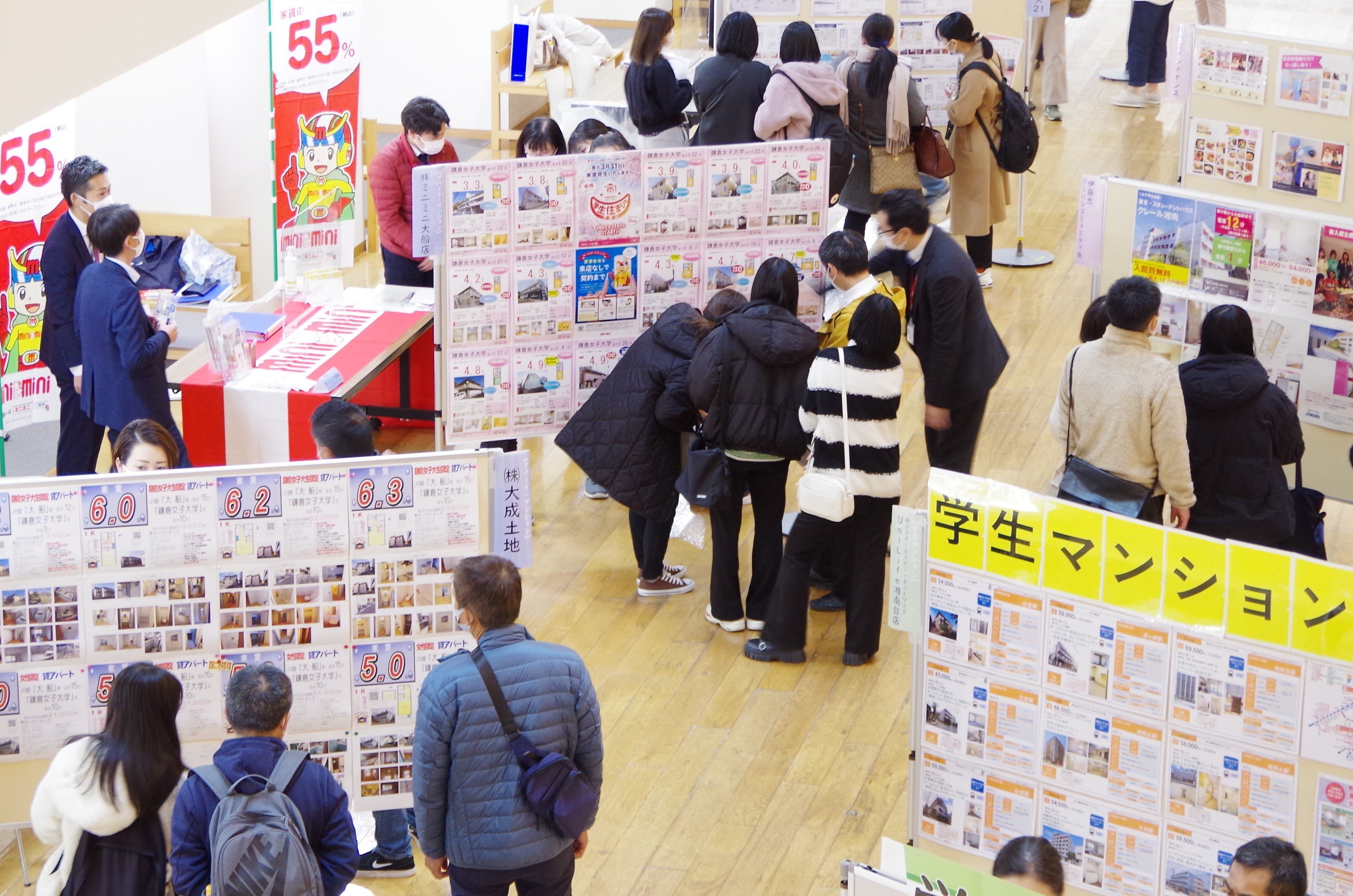 当日は、9社の不動産会社が集まるなか、4月から一人暮らしを始める新入生および在学生、多くの皆さまにお越しいただき、アパートやマンション、学生会館等の情報提供を行いました。