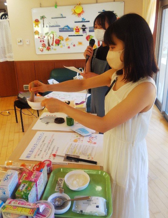 ゼミ生は、歯や口腔内の成長の様子とともに、離乳食のすすめ方の説明、10倍粥や簡単な離乳食の作り方、栄養バランスの整え方などについて、手作りの模型やイラストを用いながら伝えました。