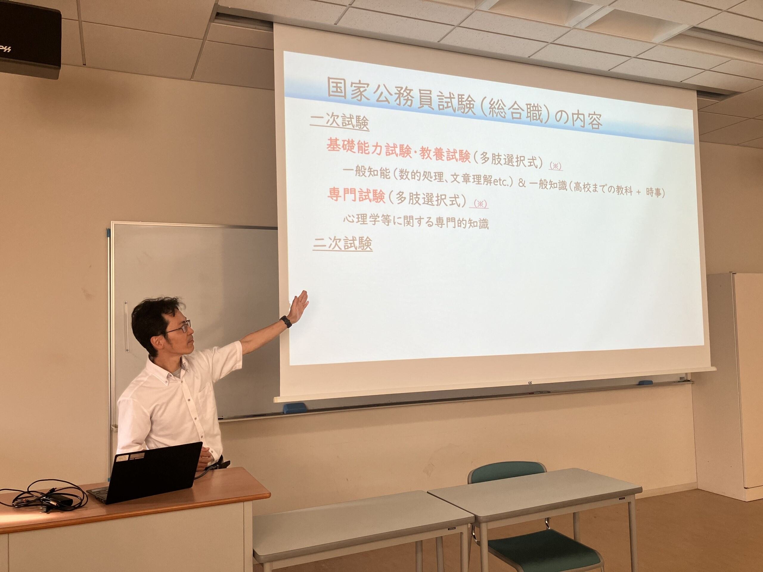 公務員の中でも、心理職や福祉職は、子ども心理学科で学ぶことが日々の業務に直結する職種です。「児童相談所で働きたい」、「県の障害者施設に勤めて障害のある人をサポートしたい」といったことばは学科の学生や、オープンキャンパスに来てくれた高校生からも多く聞かれます。社会の中で欠かすことのできない大事な仕事、やりがいのある仕事だと思います。「公務員受験対策ガイダンス」では公務員の種類、心理・福祉に関わる職種にはどういうものがあり、どういった場で活躍しているのか、試験の概要やスケジュールはどんな感じか...といったことを紹介しています。2024年度は7月19日に対面で開催しました。当日に参加した学生は少なかったものの、積極的に質問する姿も見られ、学生の強い情熱が感じられました(当日の様子を録画したものを今後オンデマンドで配信し、学生が好きな時に視聴できるようにする予定です)。