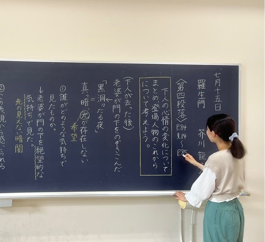 また、各自で作成した『羅生門』の学習指導案を基に、板書も行いました。授業時間1時間分(50分)の板書は初めてという学生が多く、想像よりも難しく私自身も時間がかかりました。しかし、この授業では、板書の際の注意事項について詳細に解説をしていただけるので、初めての板書がこの授業でよかったと考えている学生は多いと思います。